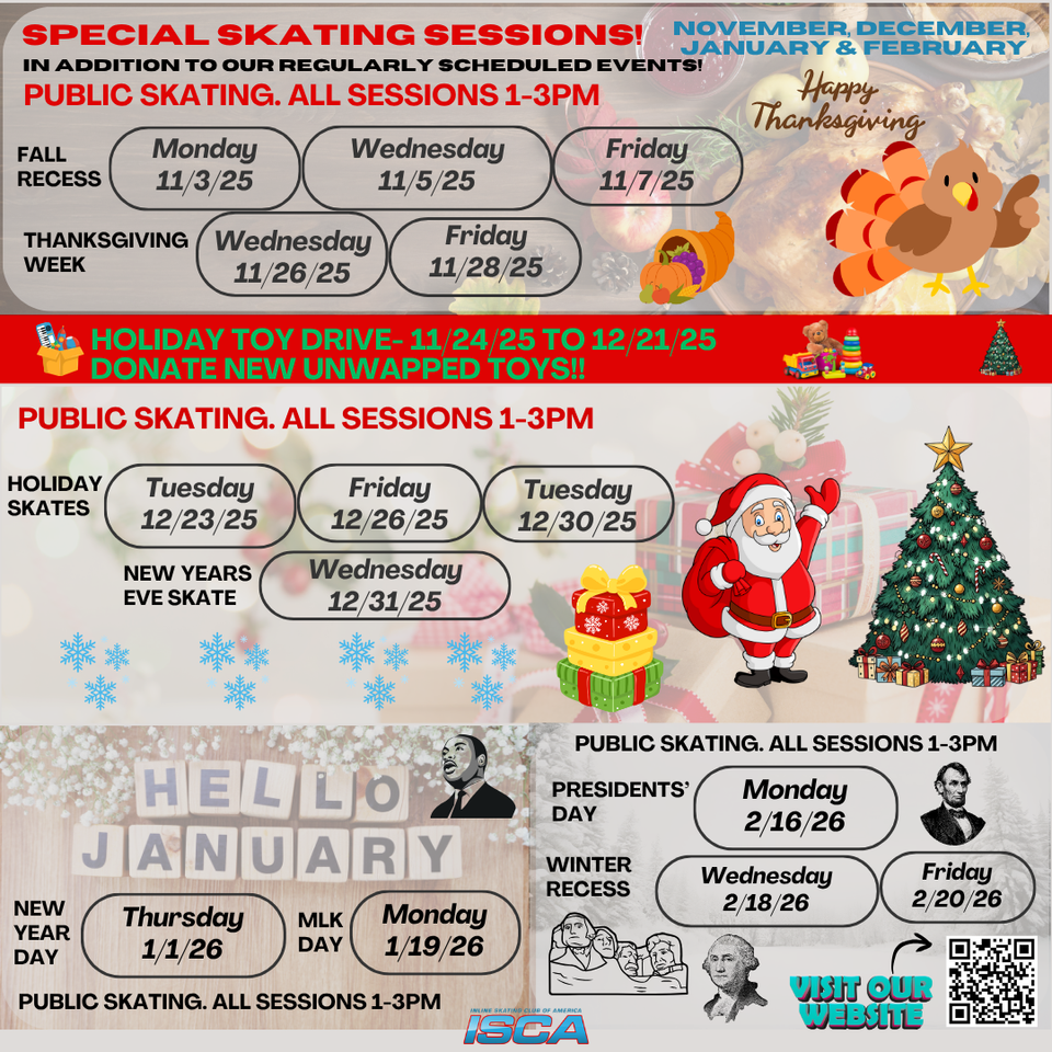 Open Skating Hours :Saturday 1pm - 3pm &. Sunday 1pm-3pm