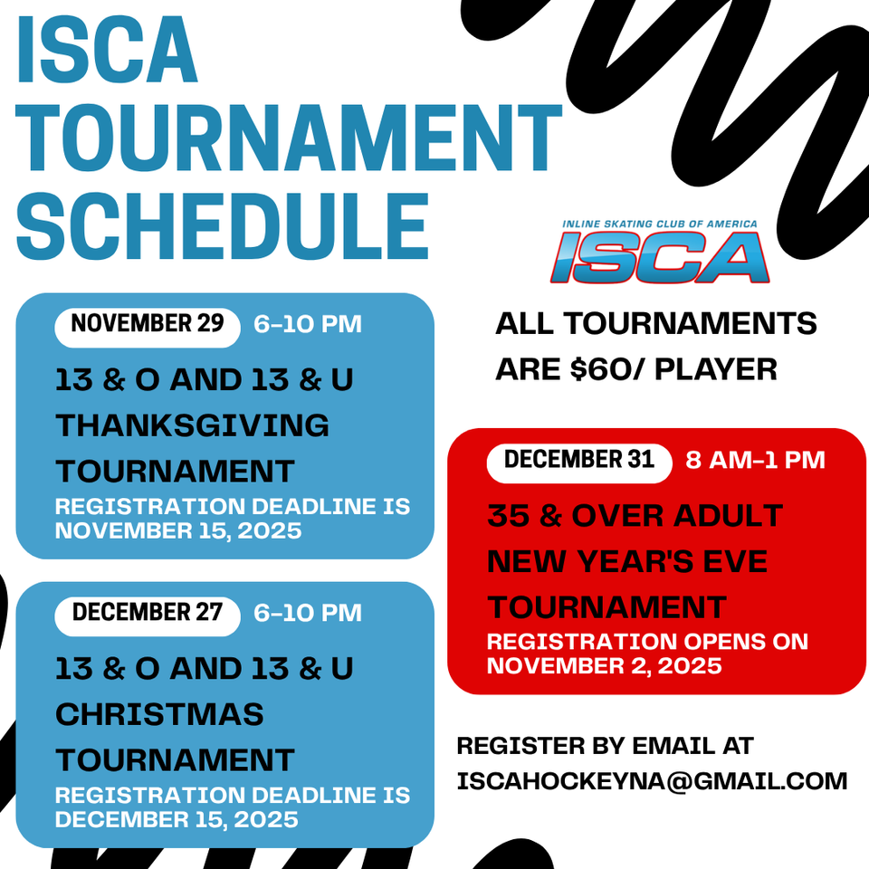 Check out our upcoming tournaments! Register by emailing iscahockeyna@gmail.com