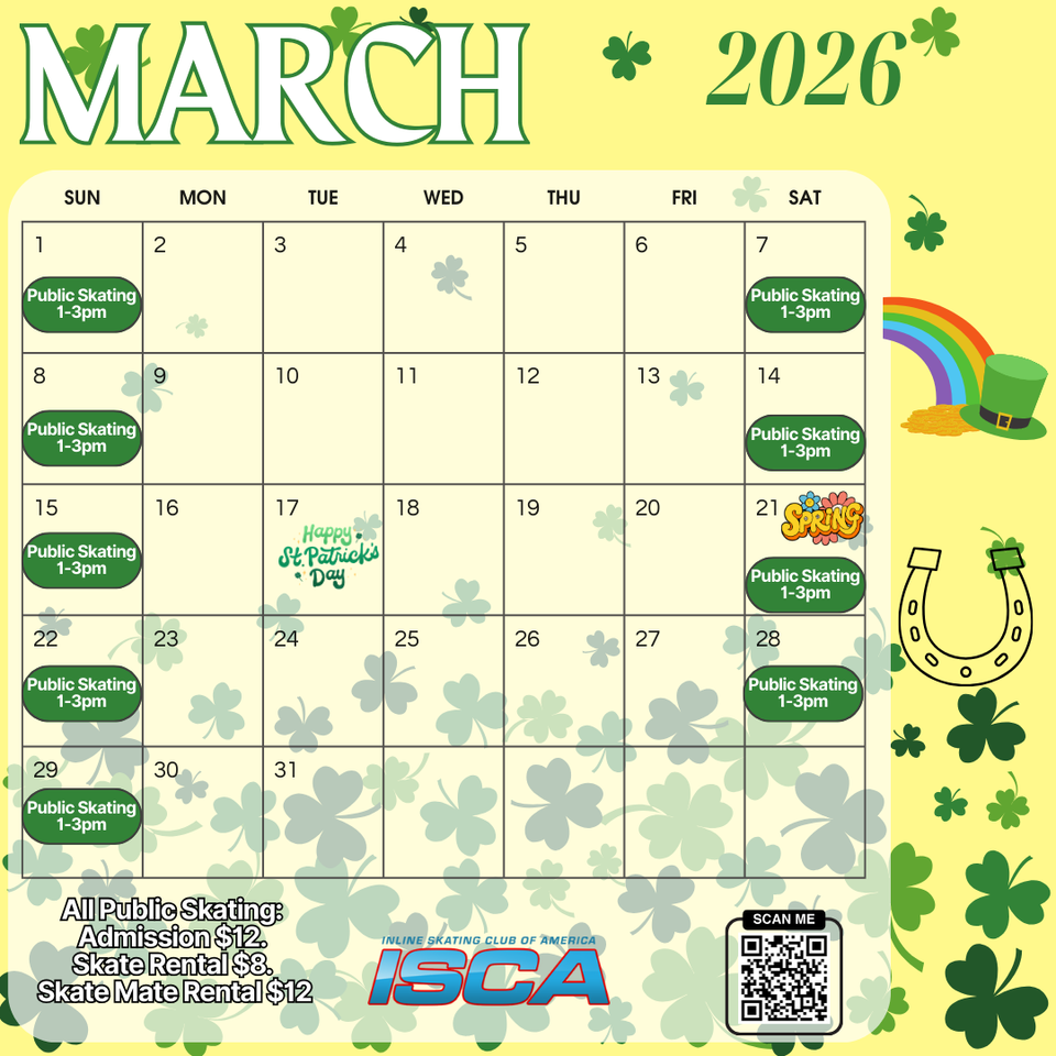 Open Skating Hours - PLEASE CHECK THE HOME PAGE FOR ANY SPECIAL SESSIONS OR CANCELLATIONS Click here for 3 Month Calendar: specialeventscalendarjan.feb.march26